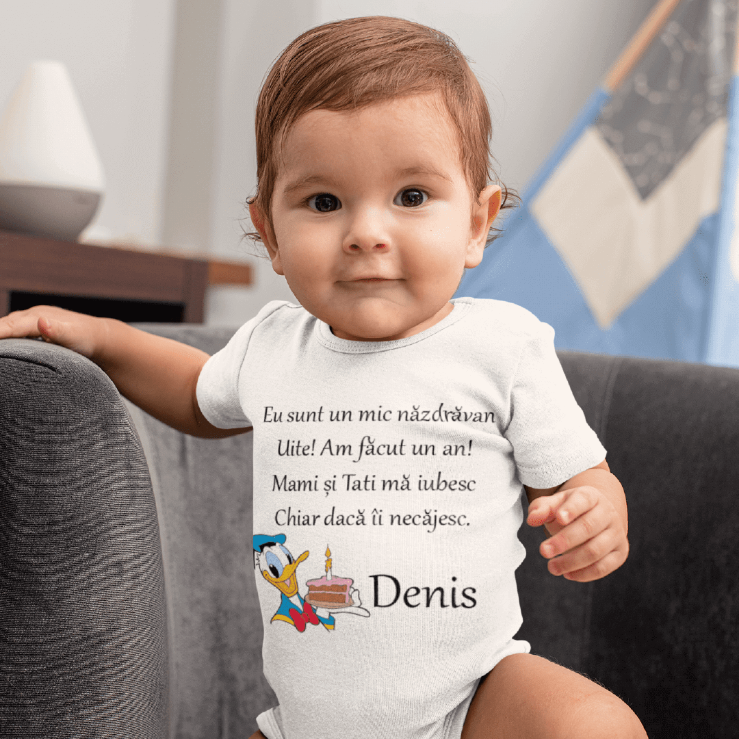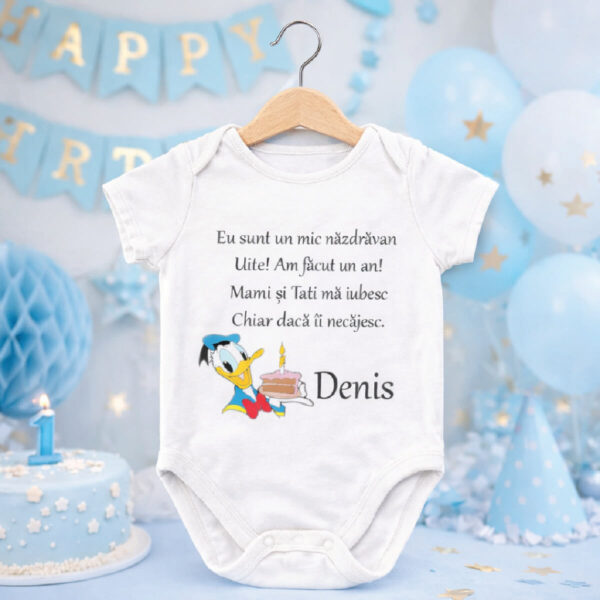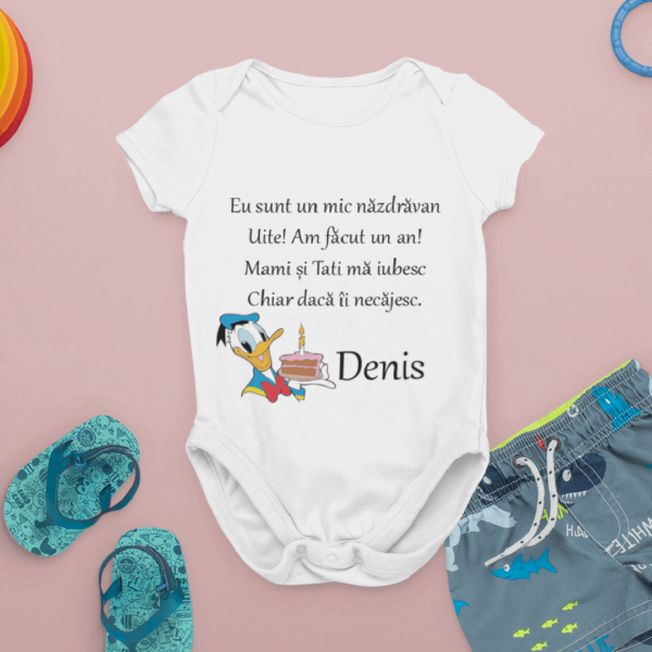 Alege și tu un Body Personalizat cu mesaj pentru petrecerea micuțului. Noi am ales un design tematic, condimentat cu personajul Donald Duck. Ție îți revine sarcina de a completa acest design cu un mesaj reprezentativ precum și  cu numele sărbătoritului.