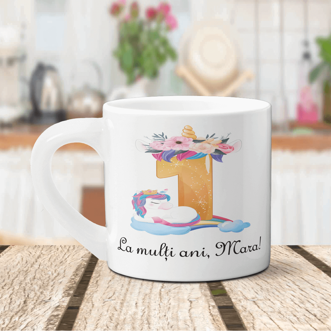 Cană pentru copii personalizată cu poză și mesaj - Cifră aniversară unicorn 1 Cană pentru copii personalizată cu poză și mesaj - Cifră aniversară unicorn 1