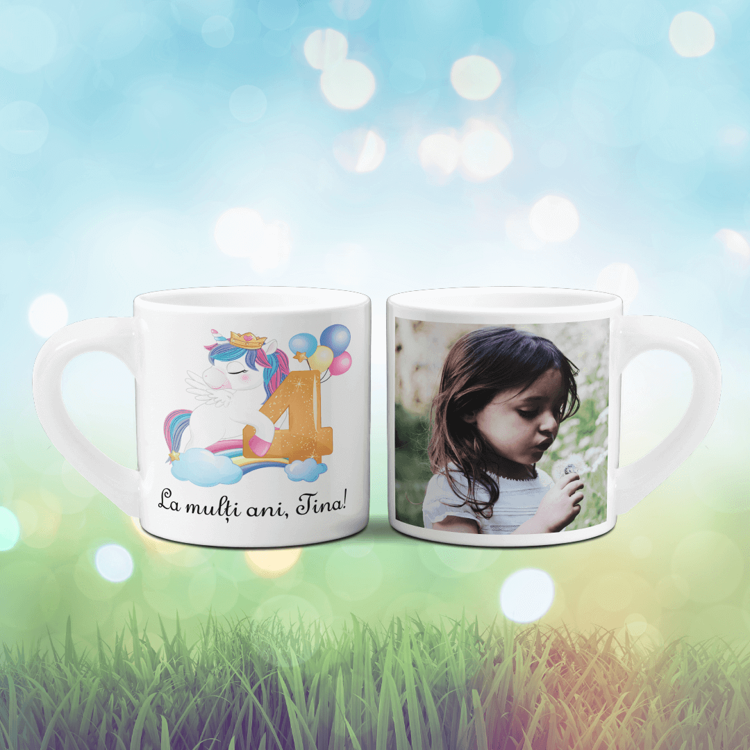 Cană pentru copii personalizată cu poză și mesaj - Cifră aniversară unicorn 4 Cană pentru copii personalizată cu poză și mesaj - Cifră aniversară unicorn 4