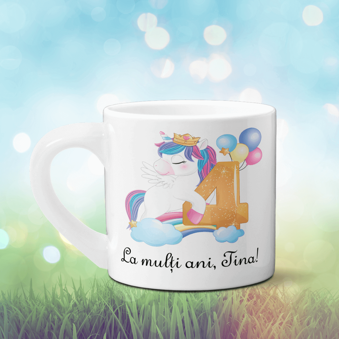 Cană pentru copii personalizată cu poză și mesaj – Cifră aniversară unicorn 4