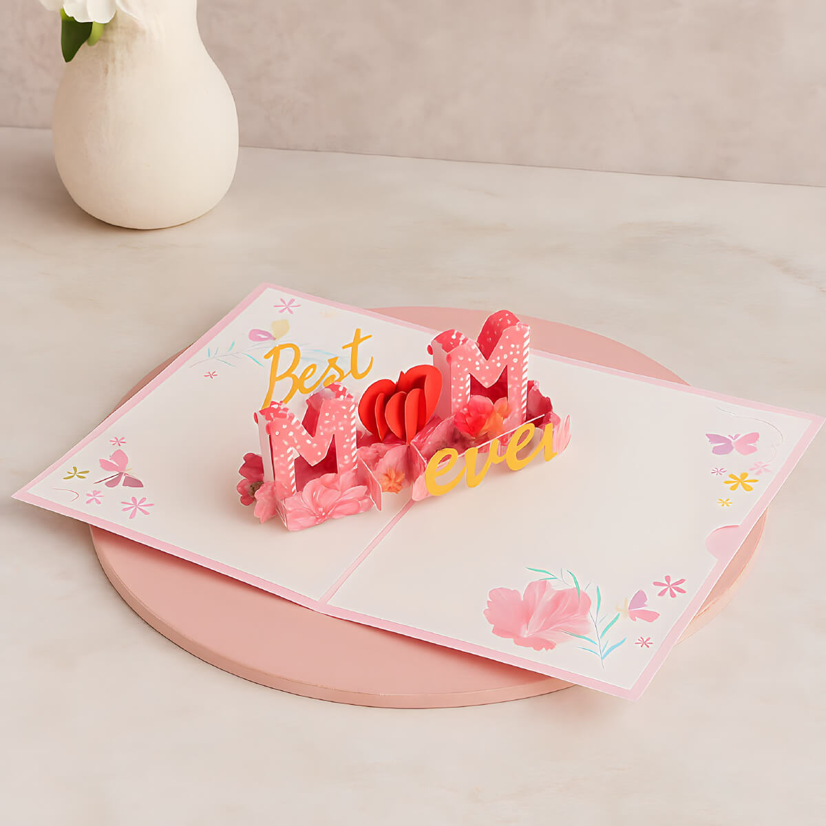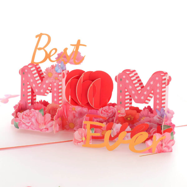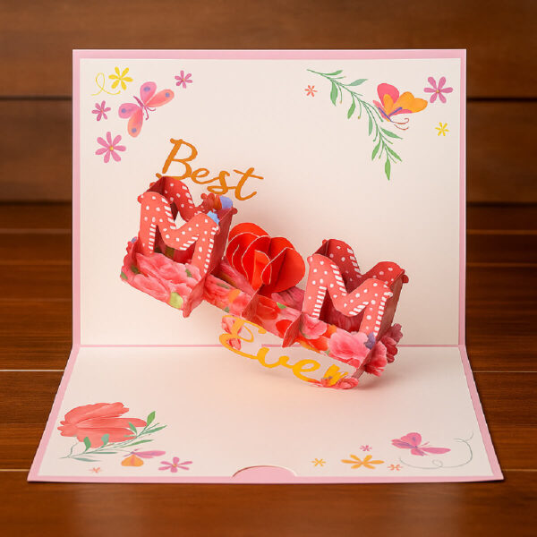 Felicitare 3D pentru Mama – un cadou delicat și emoționant pentru Ziua Mamei și nu numai. La deschidere, se transformă într-o scenă colorată cu mesajul „Best Mom Ever”, decorată cu flori, fluturi și accente roz.