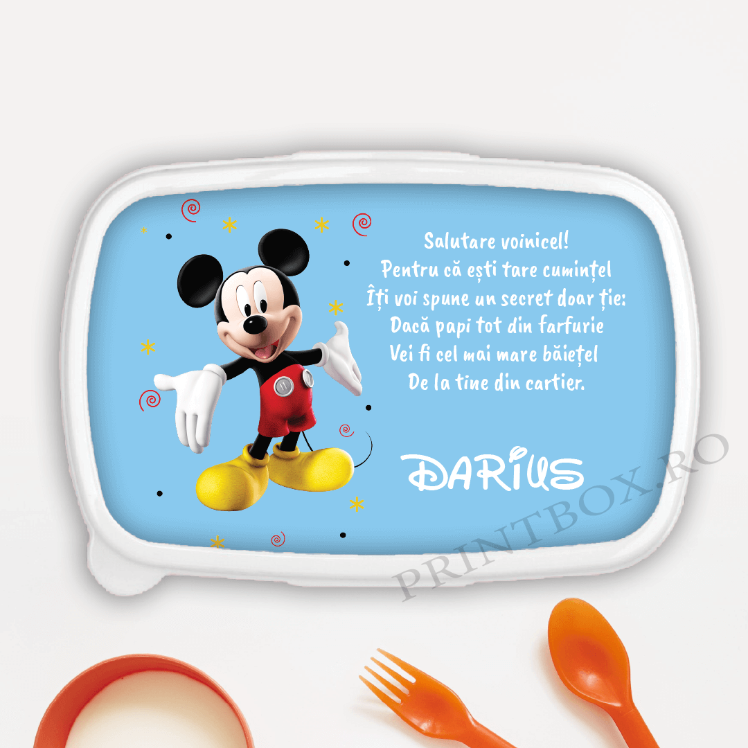 Așadar, dacă ai și tu micuți mofturoși la mâncare, acest Lunch Box Personalizat cu nume și mesaj (alături de Mickey Mouse) cu siguranță te va scăpa de o mare problemă.