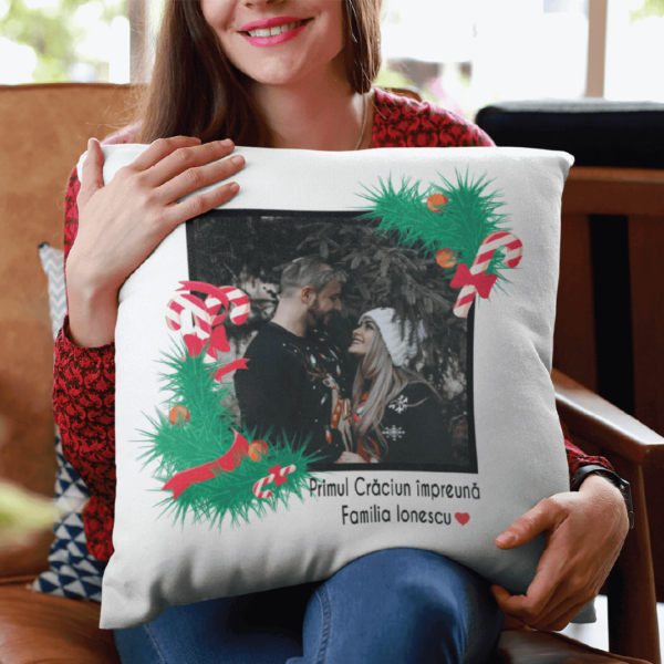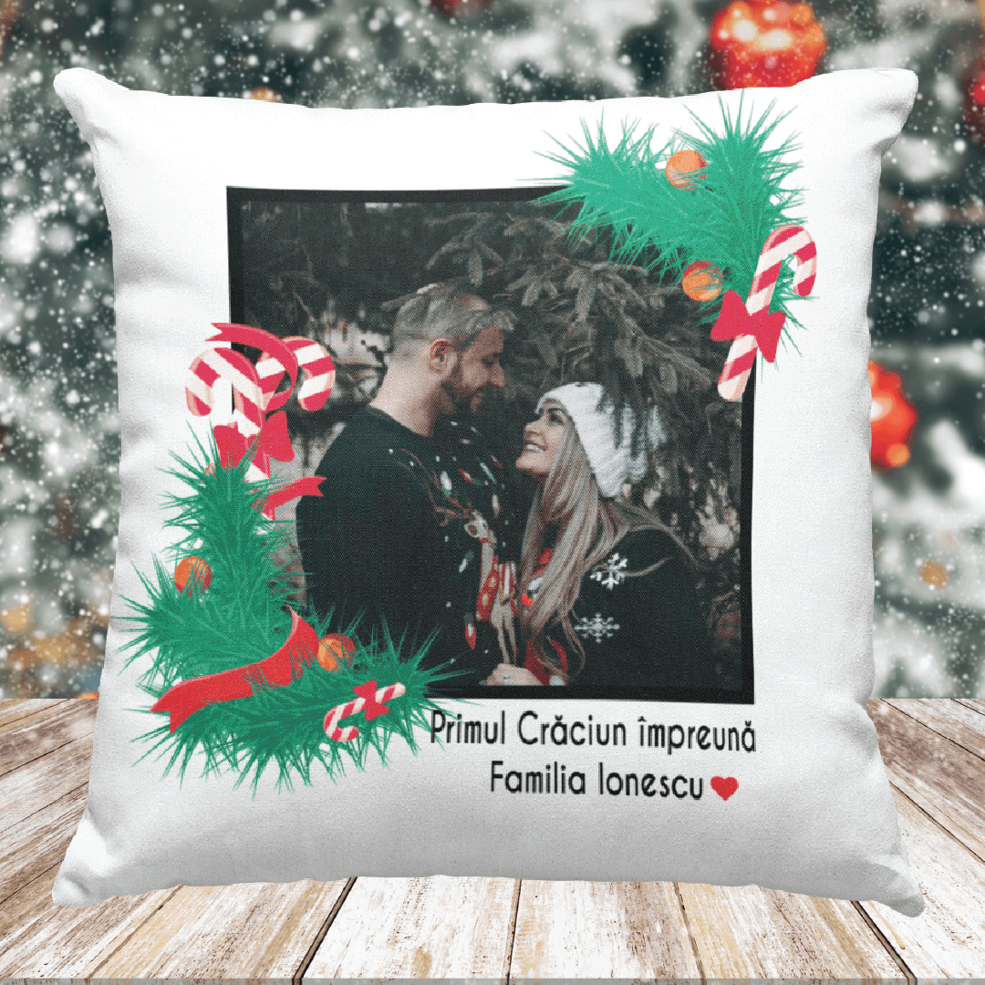 Pernă Personalizată cu poză și mesaj – Primul Crăciun împreună