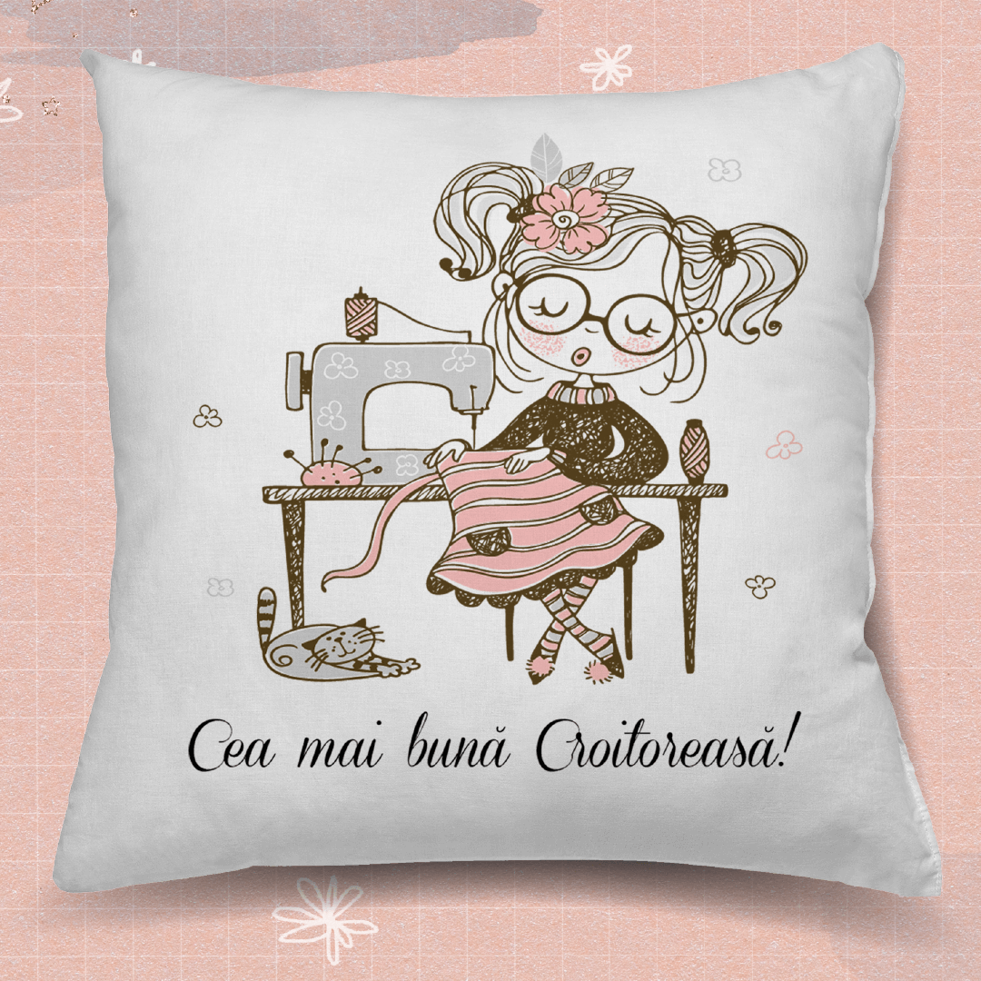 Perna personalizată cu text Cea mai bună croitoreasă, este o pernă tematică, simbolică,
