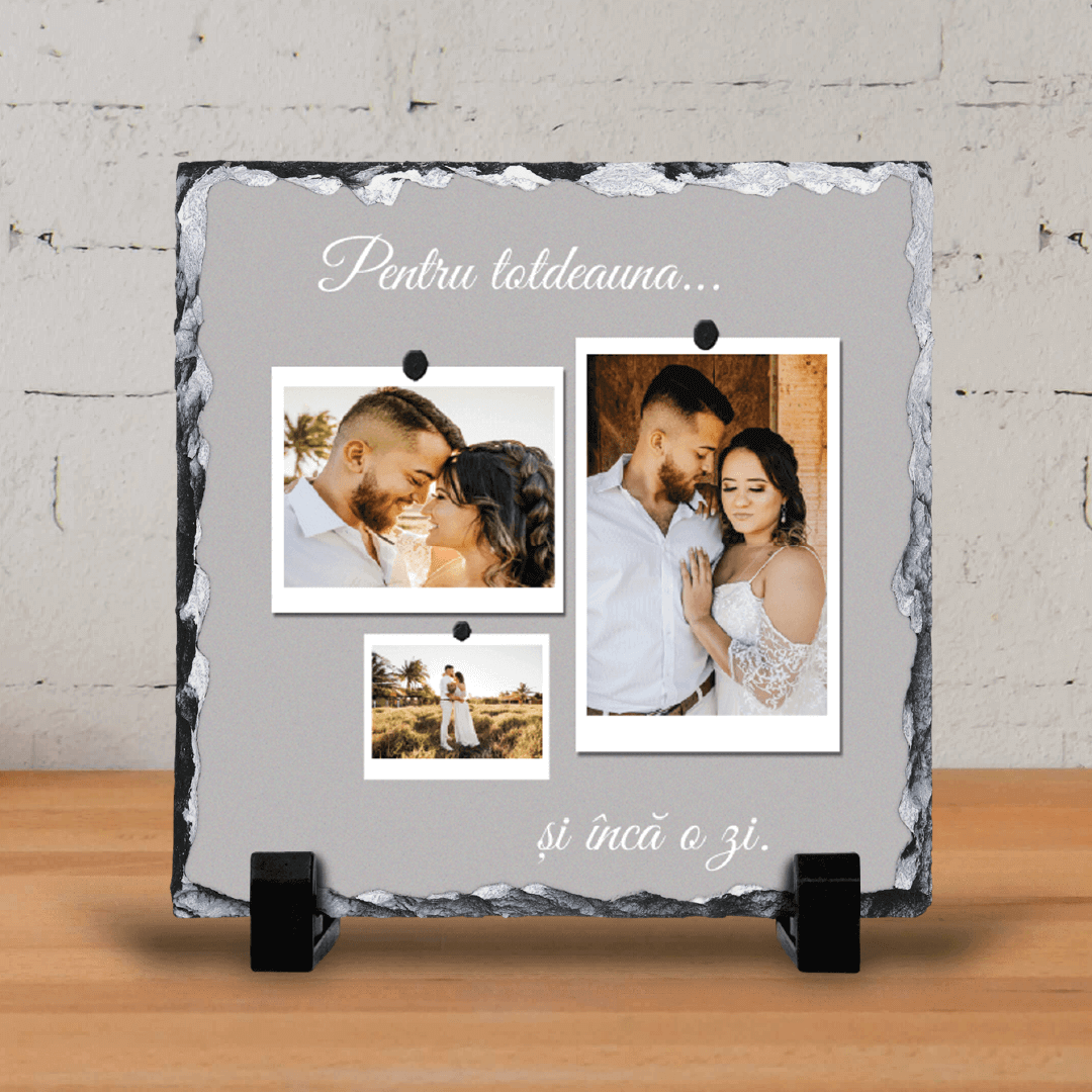 Tu cum îți păstrezi amintirile? Alege o Piatră Ardezie Pătrată Personalizată și dăruiește zâmbete. Decoreaz-o cu un mesaj reprezentativ și cu pozele voastre preferate.