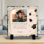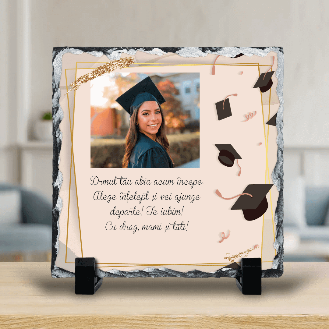 Cauți un cadou pentru un proaspăt absolvent? Nimic nu poate fi mai frumos decât o Piatră Ardezie Pătrată Personalizată cu o poză reprezentativă dar și cu un mesaj tematic.