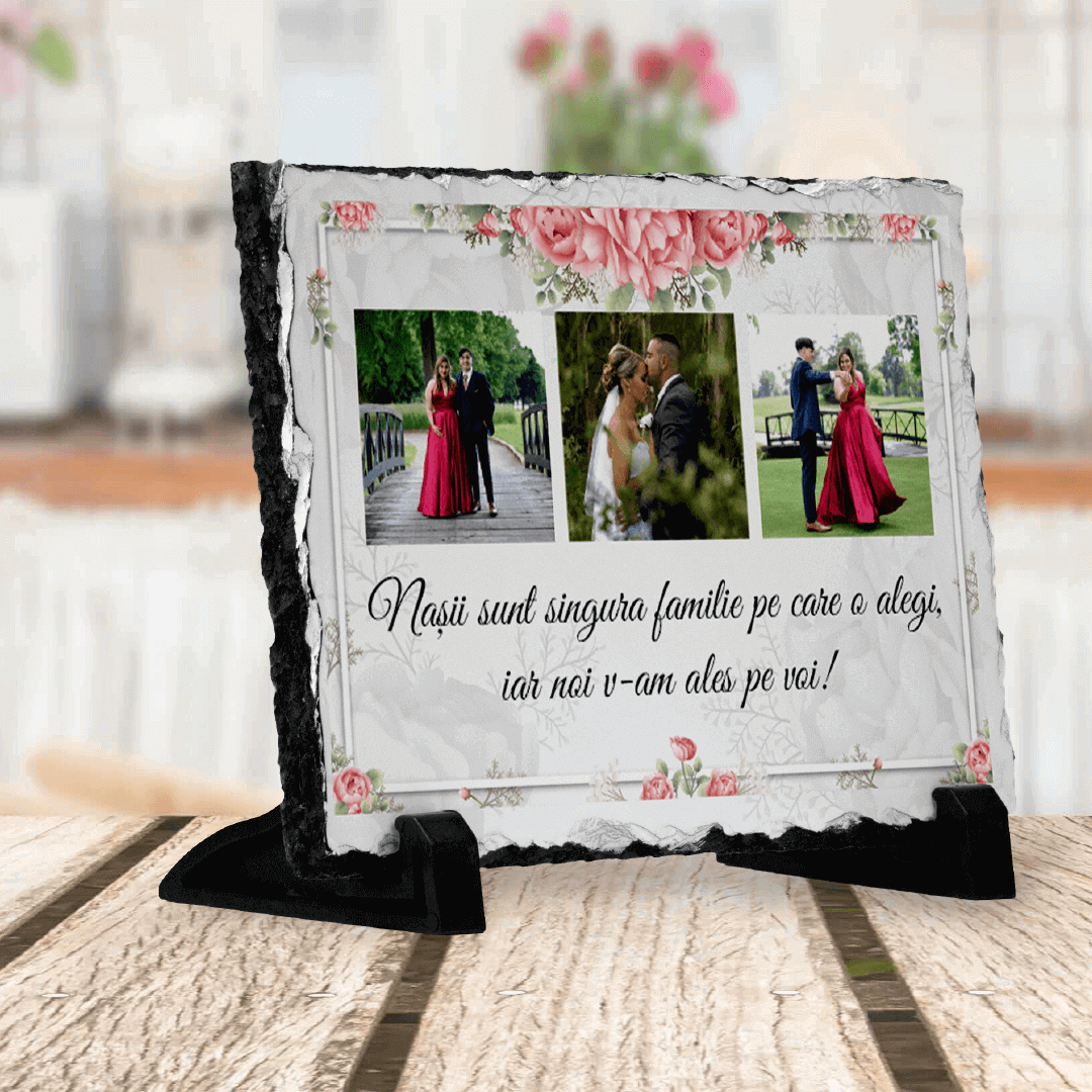 Încă nu ai găsit cadoul perfect pentru nași? Alege o piatră de ardezie personalizată cu trei poze și un mesaj simbolic. Cu siguranță îi vei surprinde!