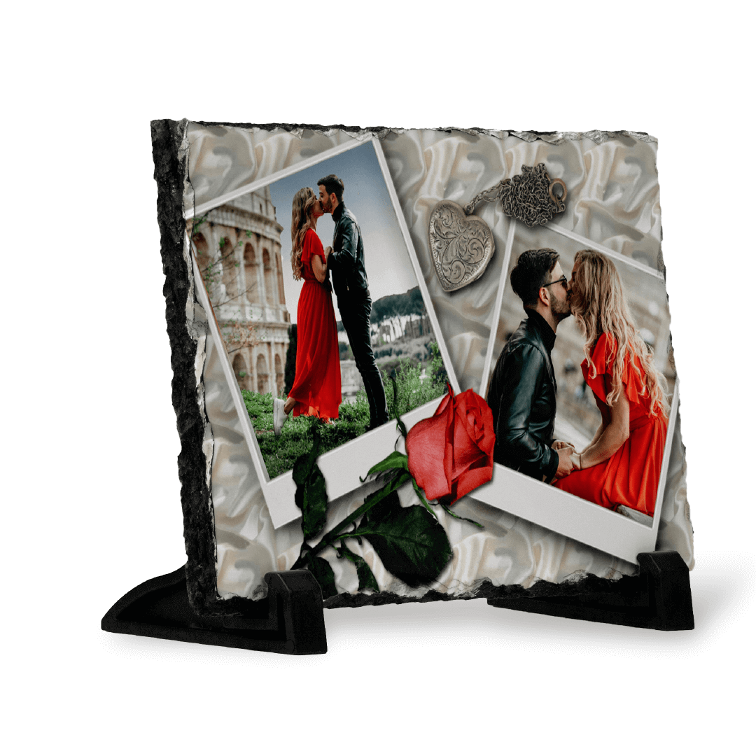 Cauți un cadou elegant și de impact? Alege o piatră de ardezie personalizată cu două poze și decorată cu trandafiri, un design potrivit pentru oricine.
