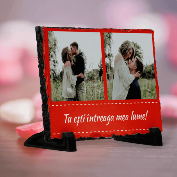Piatră Ardezie Personalizată cu două poze și text fundal roșu