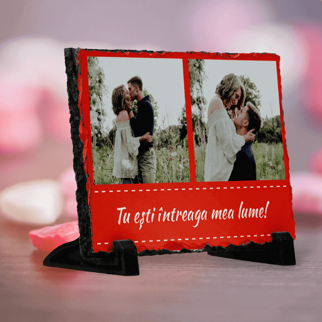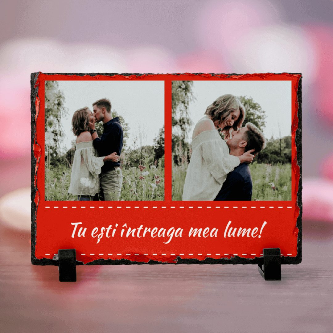 Îți garantăm că piatra ardezie personalizată cu două poze și text fundal roșu este cadoul perfect
