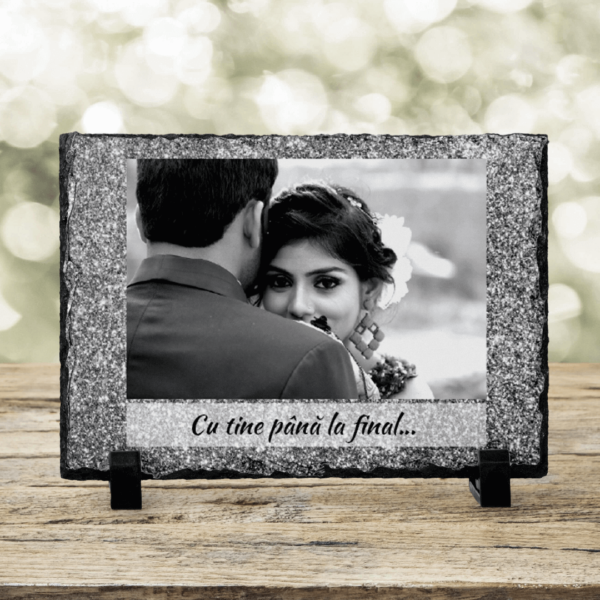 Piatra de ardezie poate fi personalizată cu o poză și mesaj.