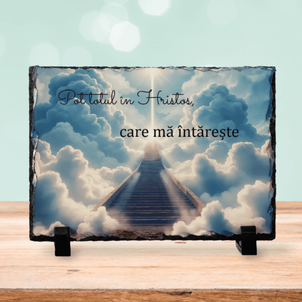 Ilustrația cu trepte spre cer și mesajul „Pot totul în Hristos, care mă întărește”