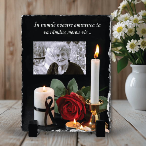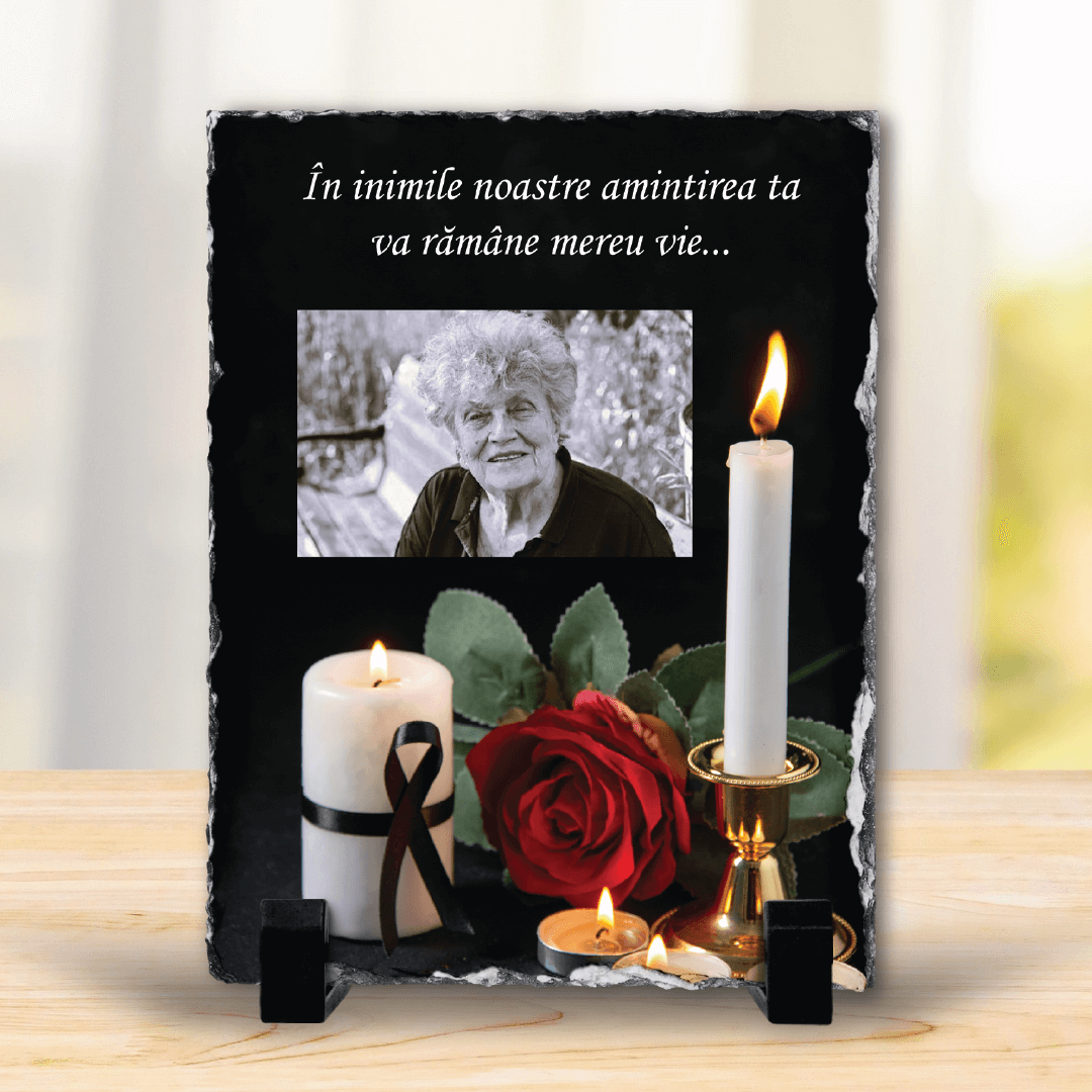 Piatră Ardezie Verticală Personalizată cu poză și mesaj Comemorativ, un omagiu din dragoste și dor pentru cei care ne-au părăsit mult prea devreme.