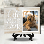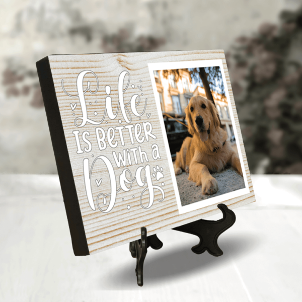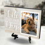 Ești în căutarea unui obiect care să îți păstreze o amintire dragă? Sau poate cauți un cadou special pentru o persoană deosebită. Îți propunem o Plachetă Foto Personalizată cu poză și mesaj simbolic – Life is better with dog.