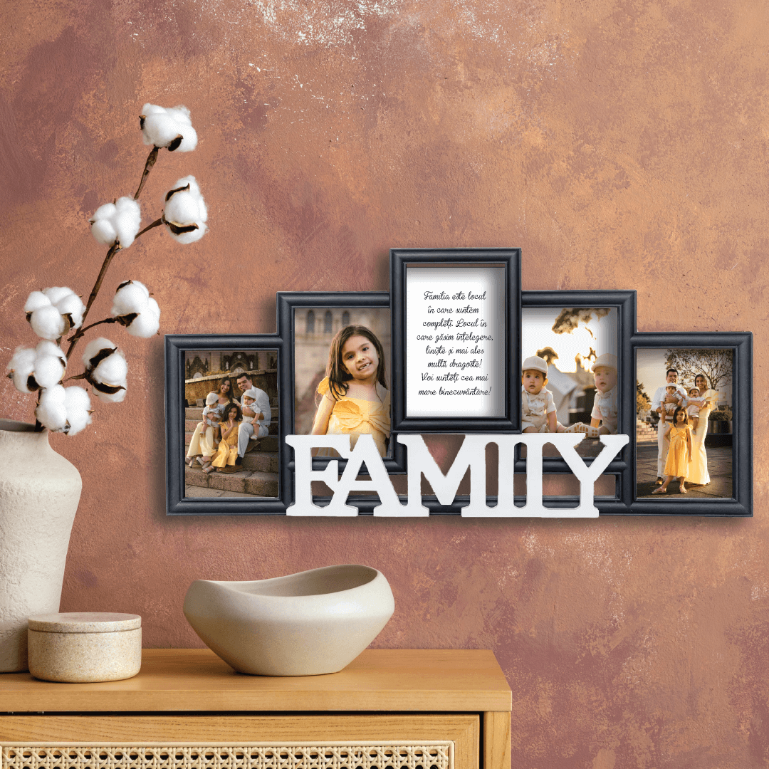 Oferă un strop de personalitate căminului tău prin intermediul unei Rame Foto FAMILY pe care o poți personaliza cu 4 poze dar și cu un mesaj.