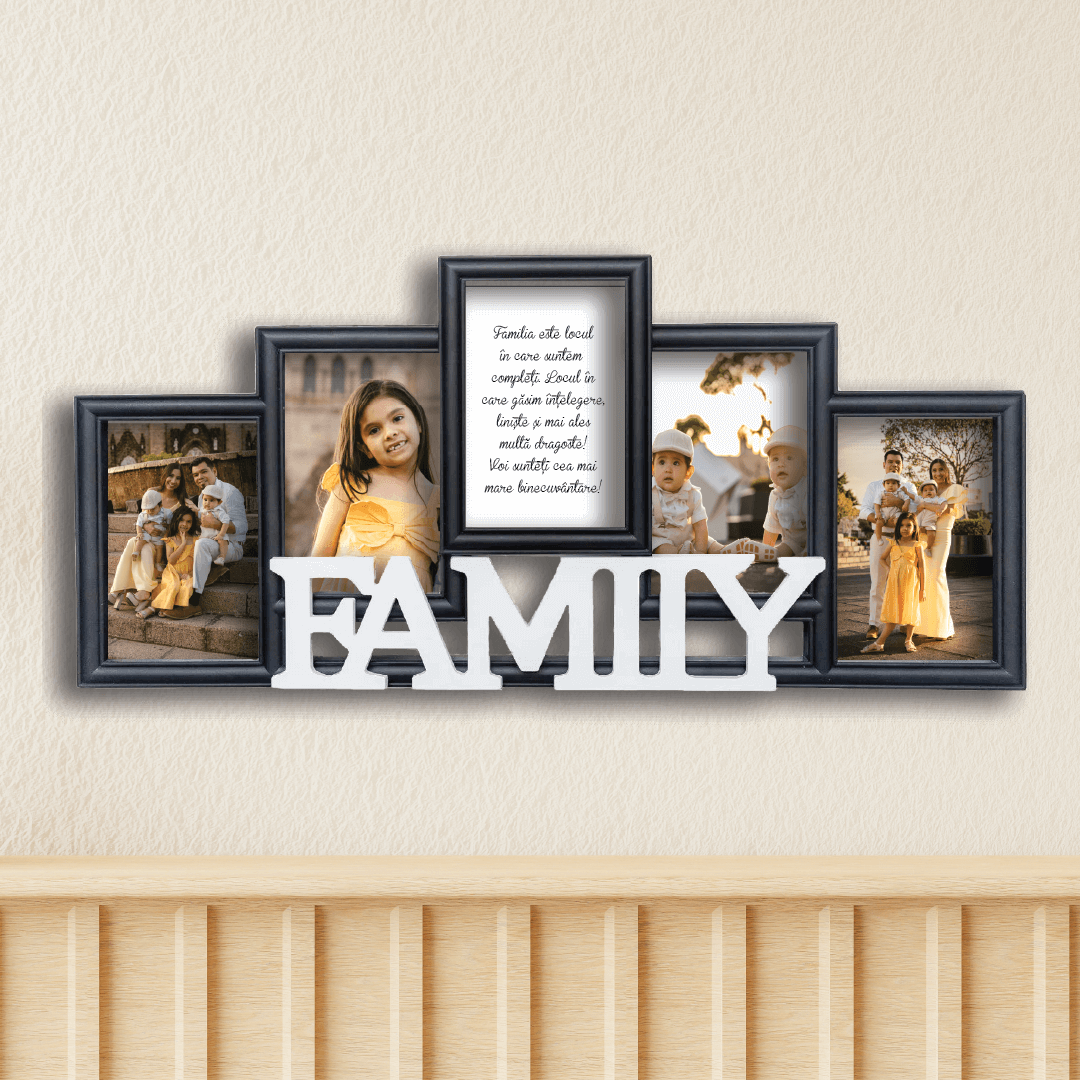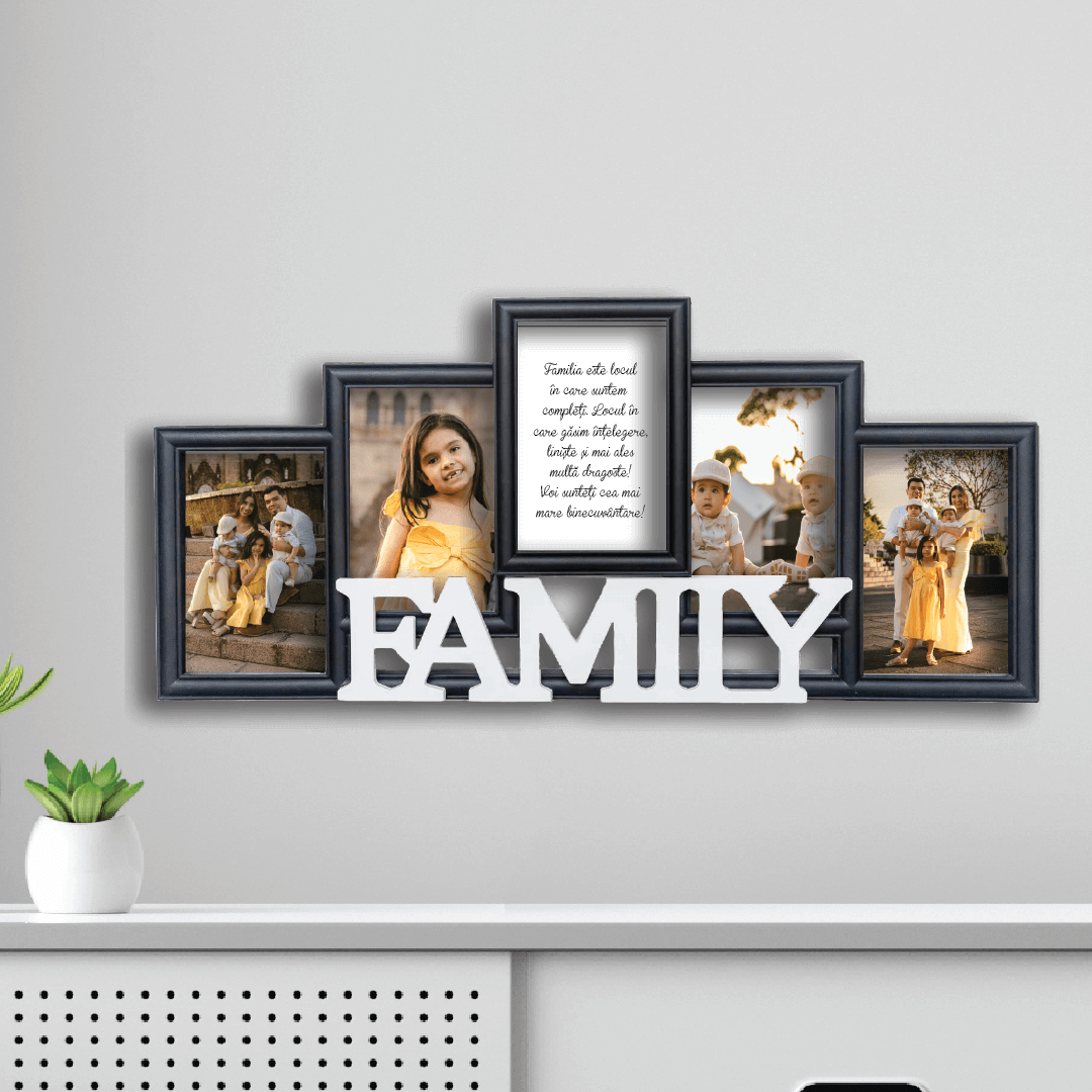 Rama Foto FAMILY poate fi personalizată cu 4 poze și mesaj.