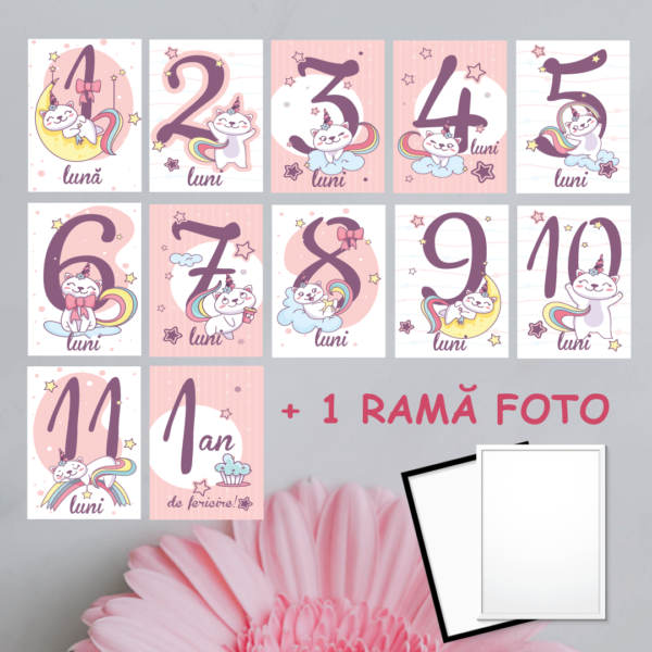 Setul conține 12 Carduri (câte unul pentru fiecare lună de viață) + o ramă foto (culoare la alegere)