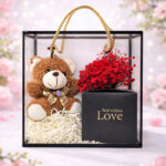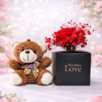 Acest set cu ursuleț și flori de săpun transmite iubire fără cuvinte, un cadou care emoționează din prima clipă fiind potrivit pentru aniversare, 8 Martie, Valentine’s Day sau o surpriză spontană.