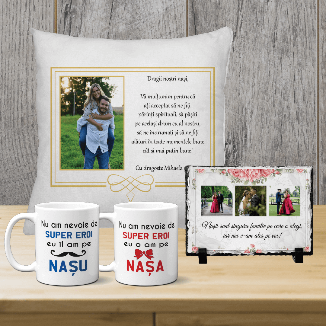 Setul este compus din: o pernă personalizată (40×40 cm), o piatră ardezie personalizată (15×20 cm), 1 cană personalizată pentru Nașa și o cană personalizată pentru Nașul.