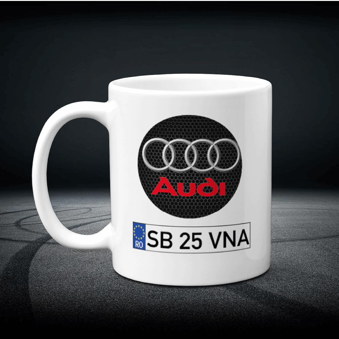 1. O cană personalizată pe care o poți decora cu sigla și numărul auto iar pentru cealaltă parte