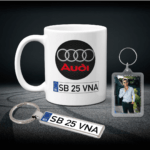 Setul este compus din: o cană personalizată cu siglă auto și număr auto + poză sau mesaj (alegerea îți aparține) pentru cealaltă parte a cănii, un breloc cu nr auto și mesaj sau siglă auto și un breloc foto personalizabil cu poză și/sau mesaj.