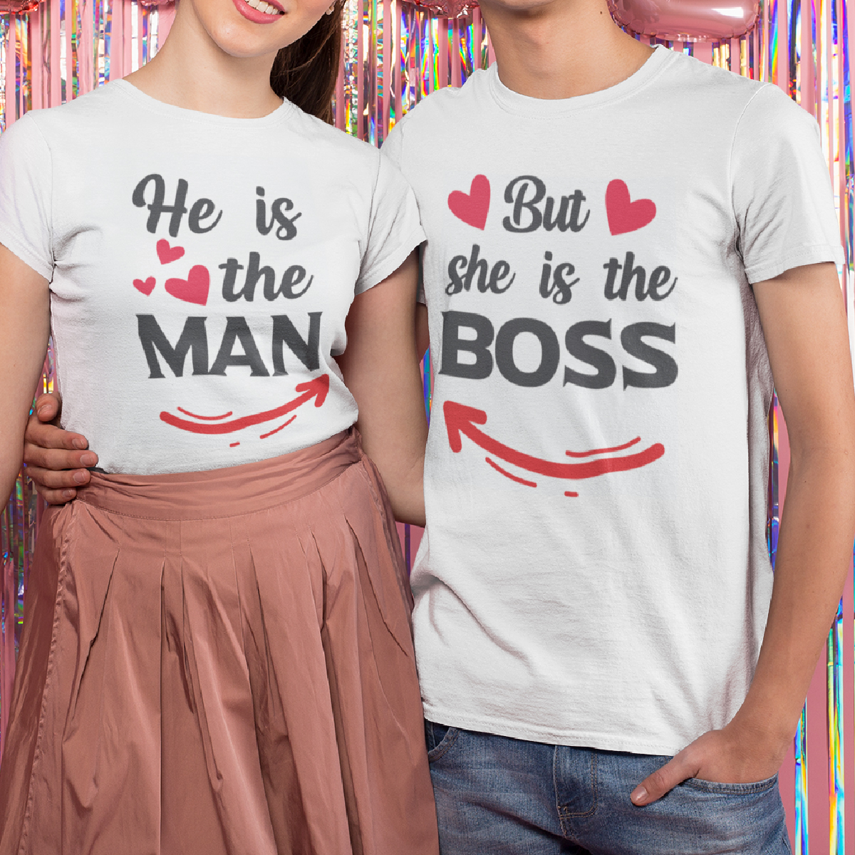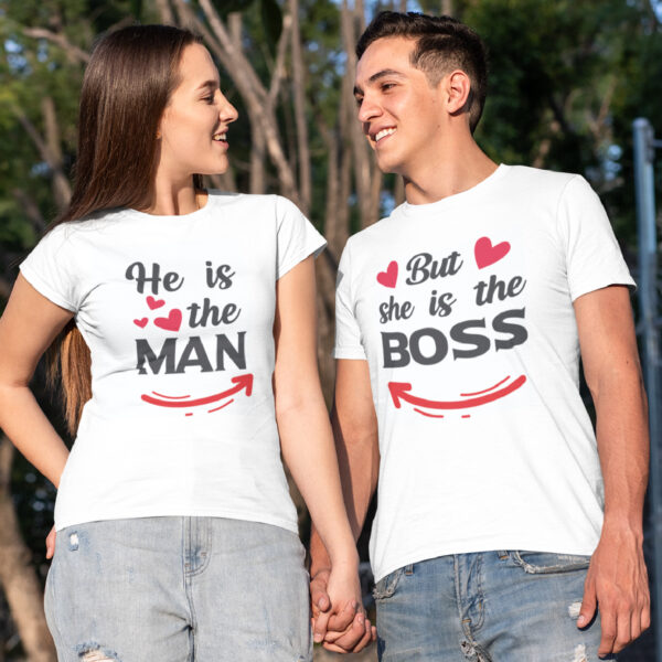 Acest set de tricouri pentru cuplu este o alegere perfectă pentru partenerii care își doresc să-și exprime relația cu umor și stil. Designul jucăuș include mesaje complementare: „He is the MAN” pentru el și „But she is the BOSS” pentru ea, evidențiind dinamica amuzantă dintre parteneri.