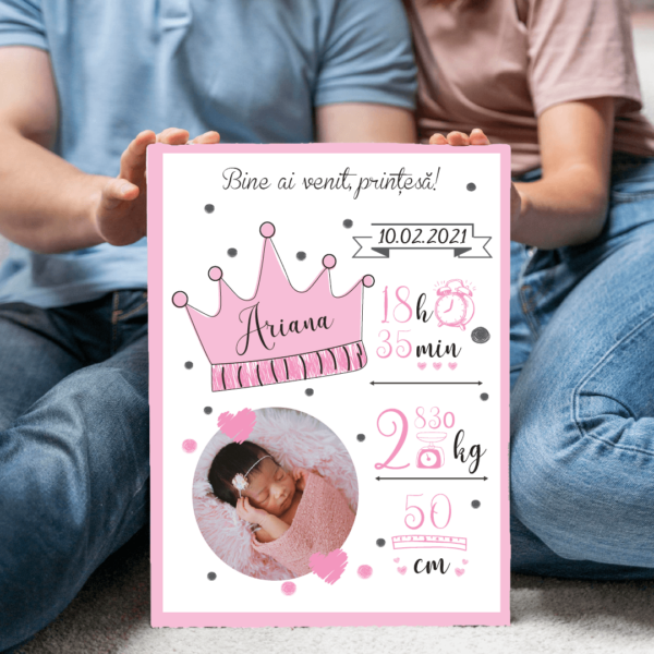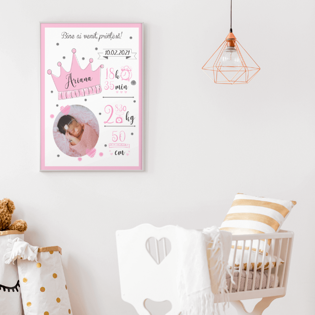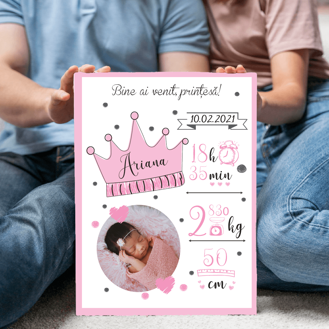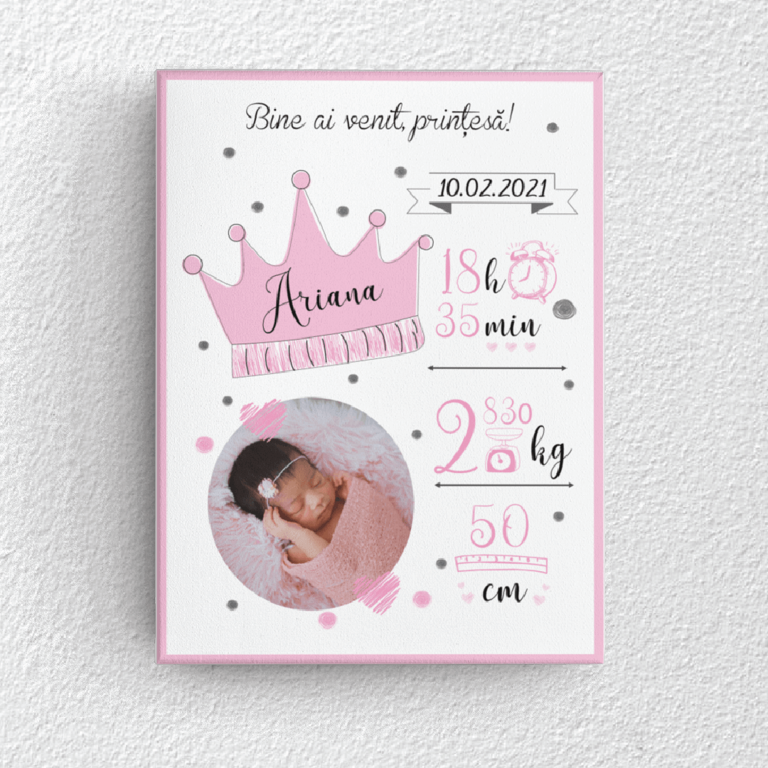 Alege să dăruiești un tablou canvas personalizat Baby Princess cu datele micuței, un cadoul potrivit de care se va bucura întreaga familie. Sau îți poți păstra chiar tu cele mai frumoase amintiri într-un tablou inedit.