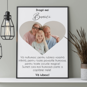 Trebuie doar să alegi dimensiunea dorită, apoi să utilizezi butonul Personalizează Produsul. Încarcă fotografiile tale în locul celor din exemplul nostru. Încă un click pe text pentru a-l modifica cu cel dorit de tine iar tabloul tău este gata!