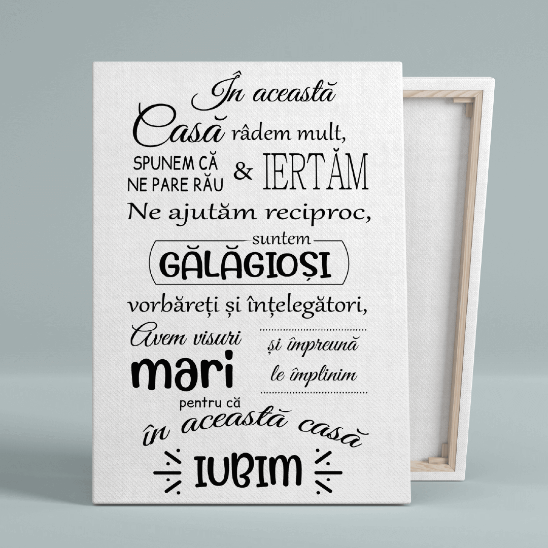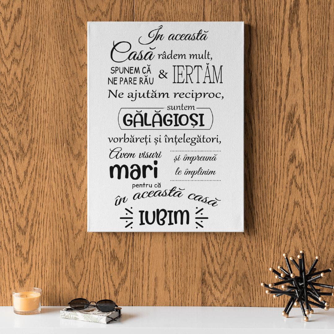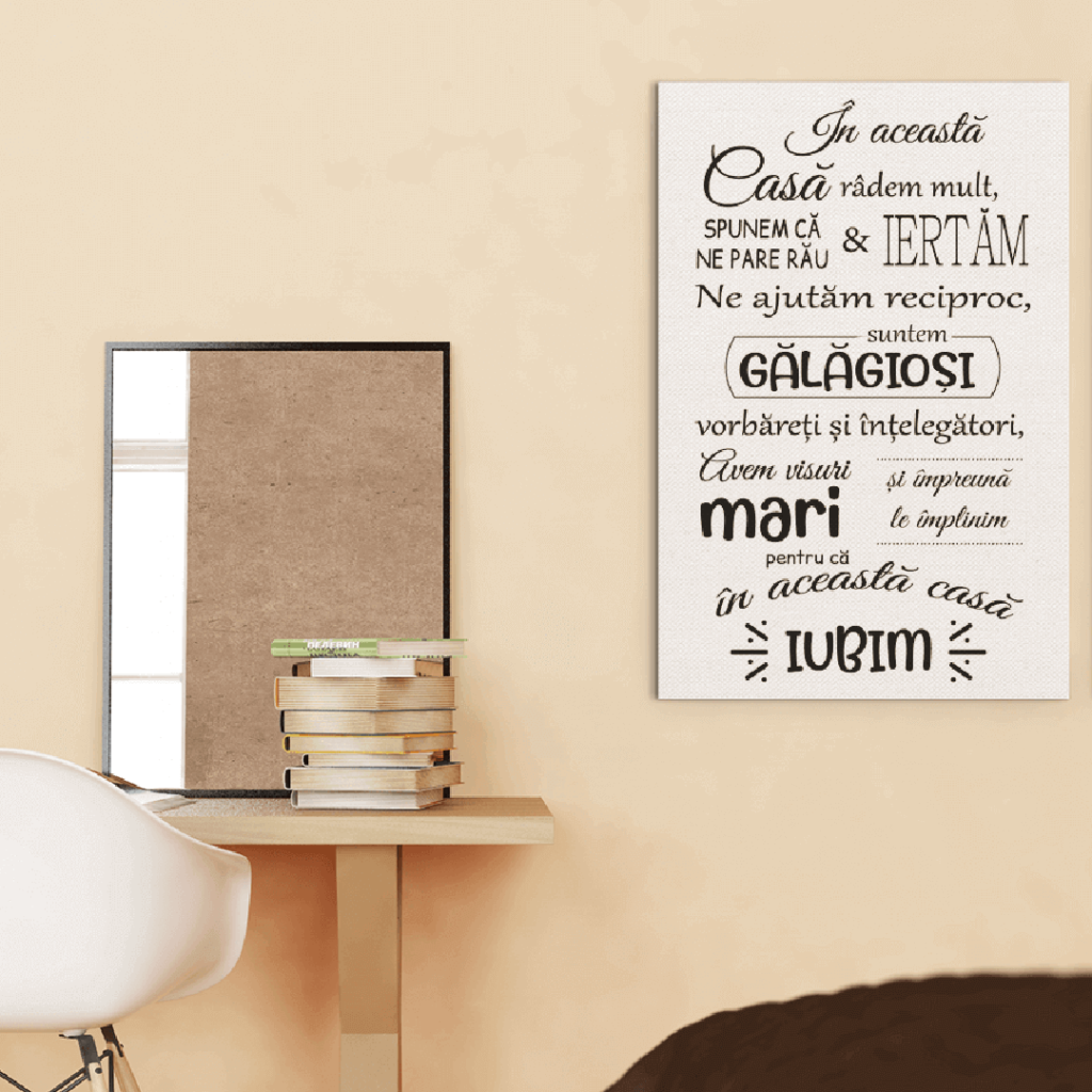 Dacă ești în căutarea unui cadou inspirat îți propunem un tablou canvas personalizat cu un design cozy și primitor! Am pus pe pânză regulile familiei, reguli de bun simț pline de iubire. Poți dărui acest tablou sau îl poți păstra. Alegerea îți aparține.