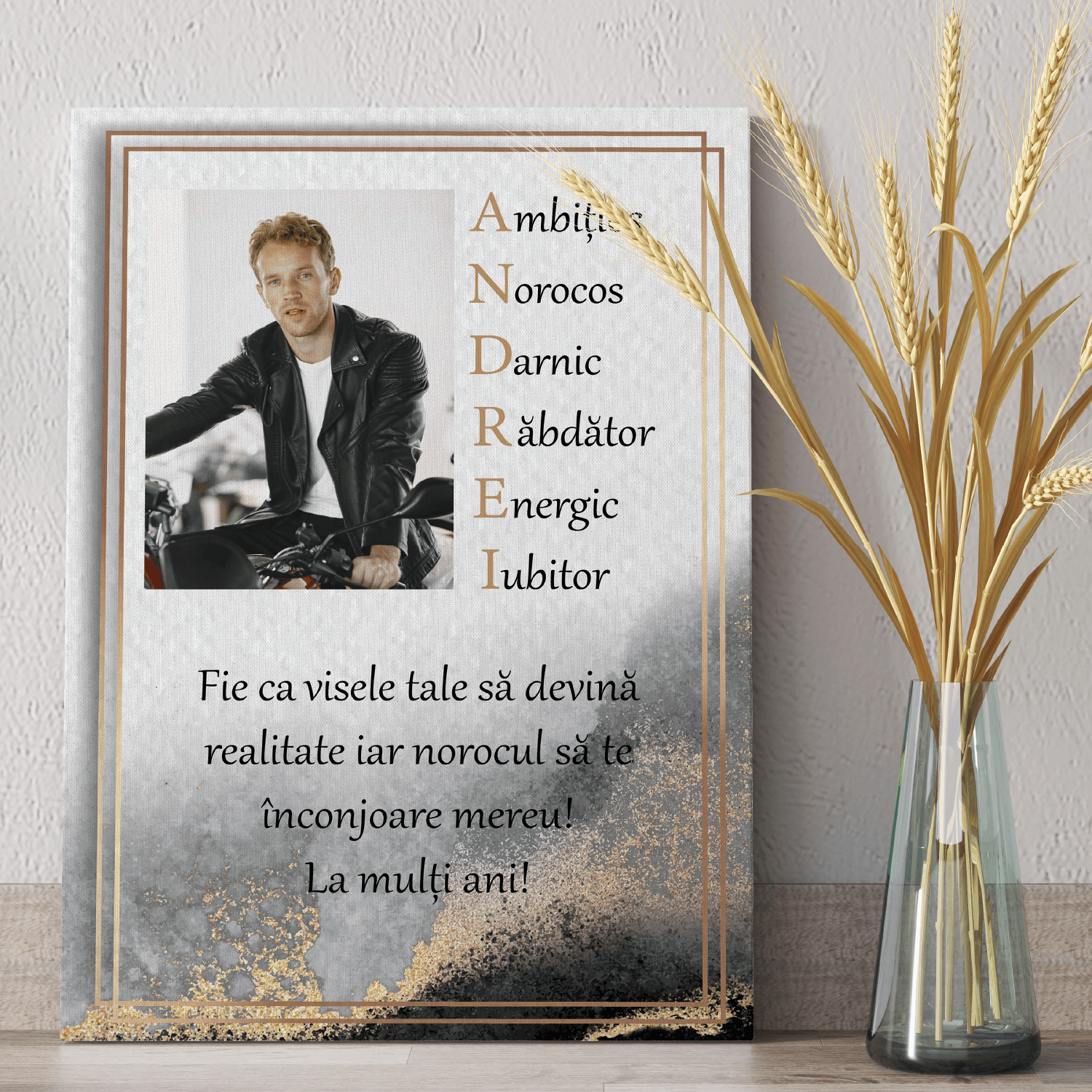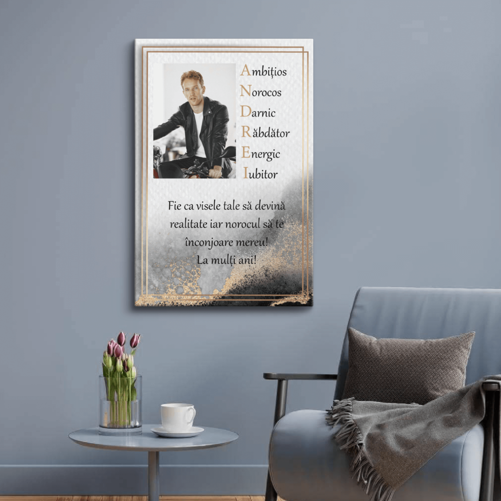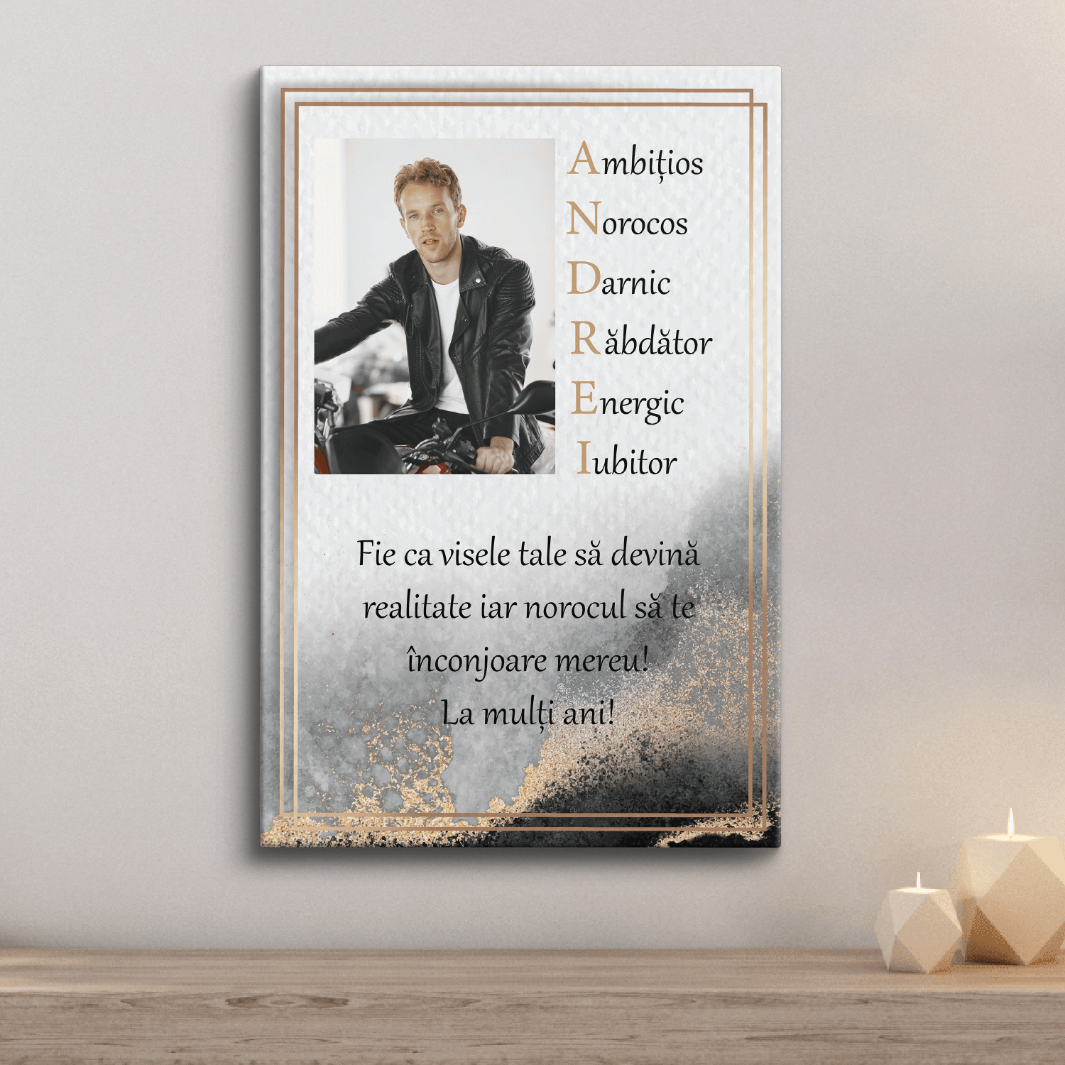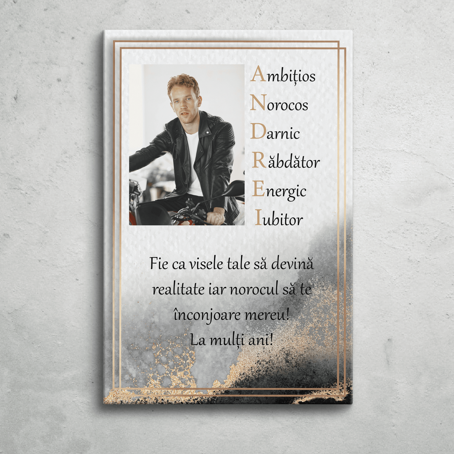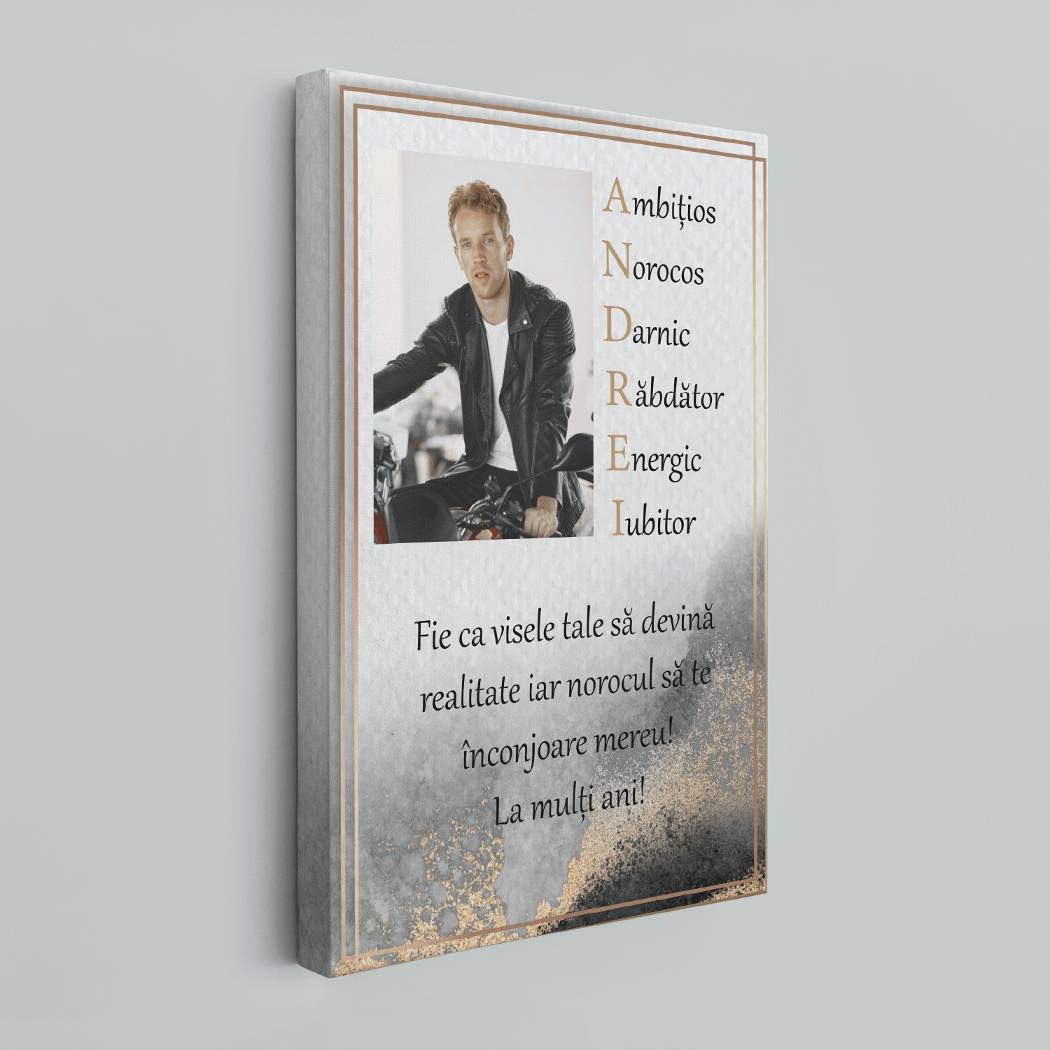 Tablou Canvas Personalizat pentru Andrei, cu poză și mesaj, semnificația numelui – perfect pentru evenimentele speciale și momente de neuitat!