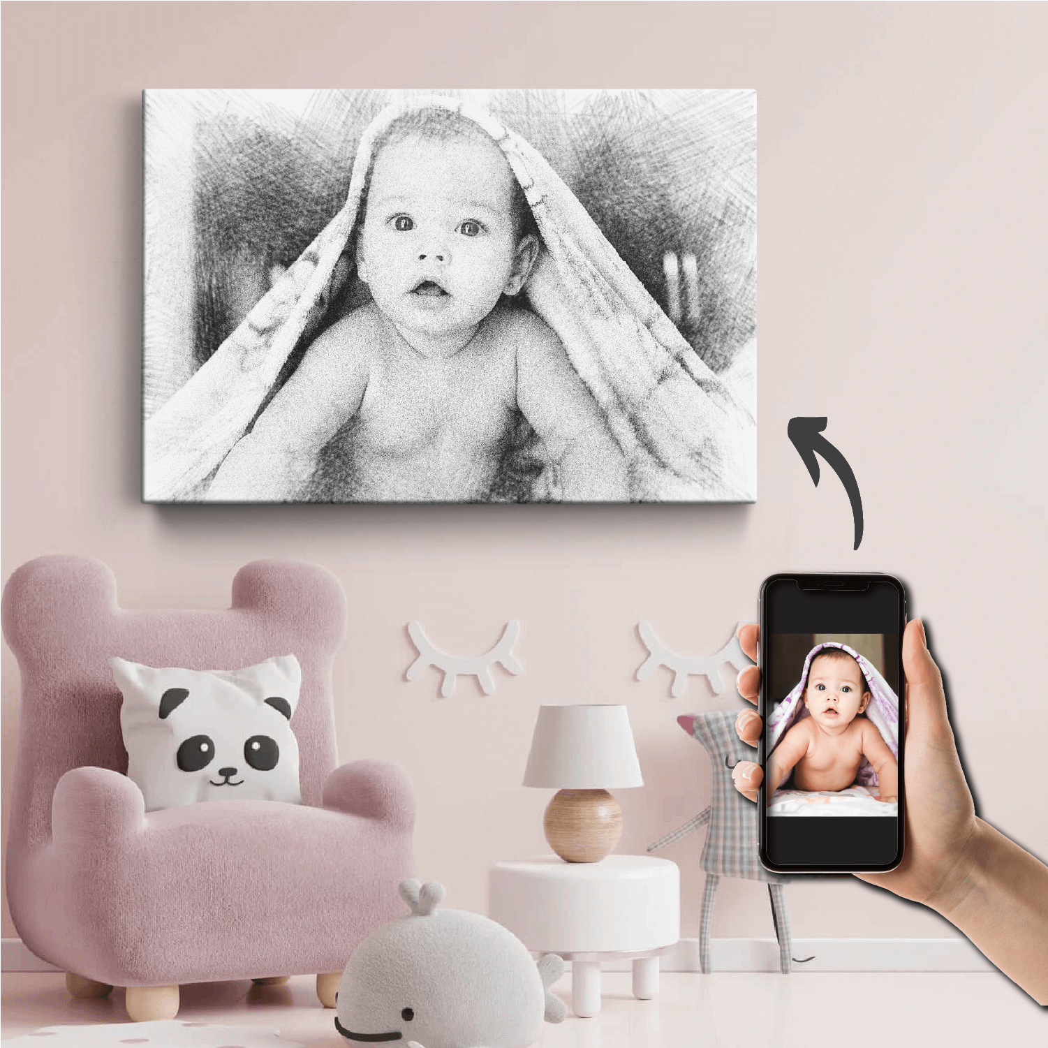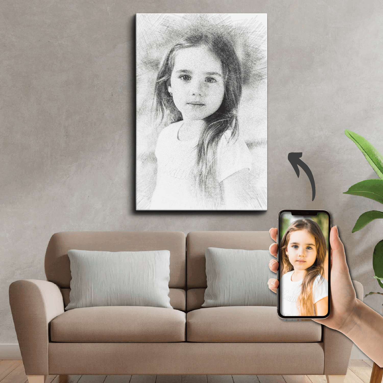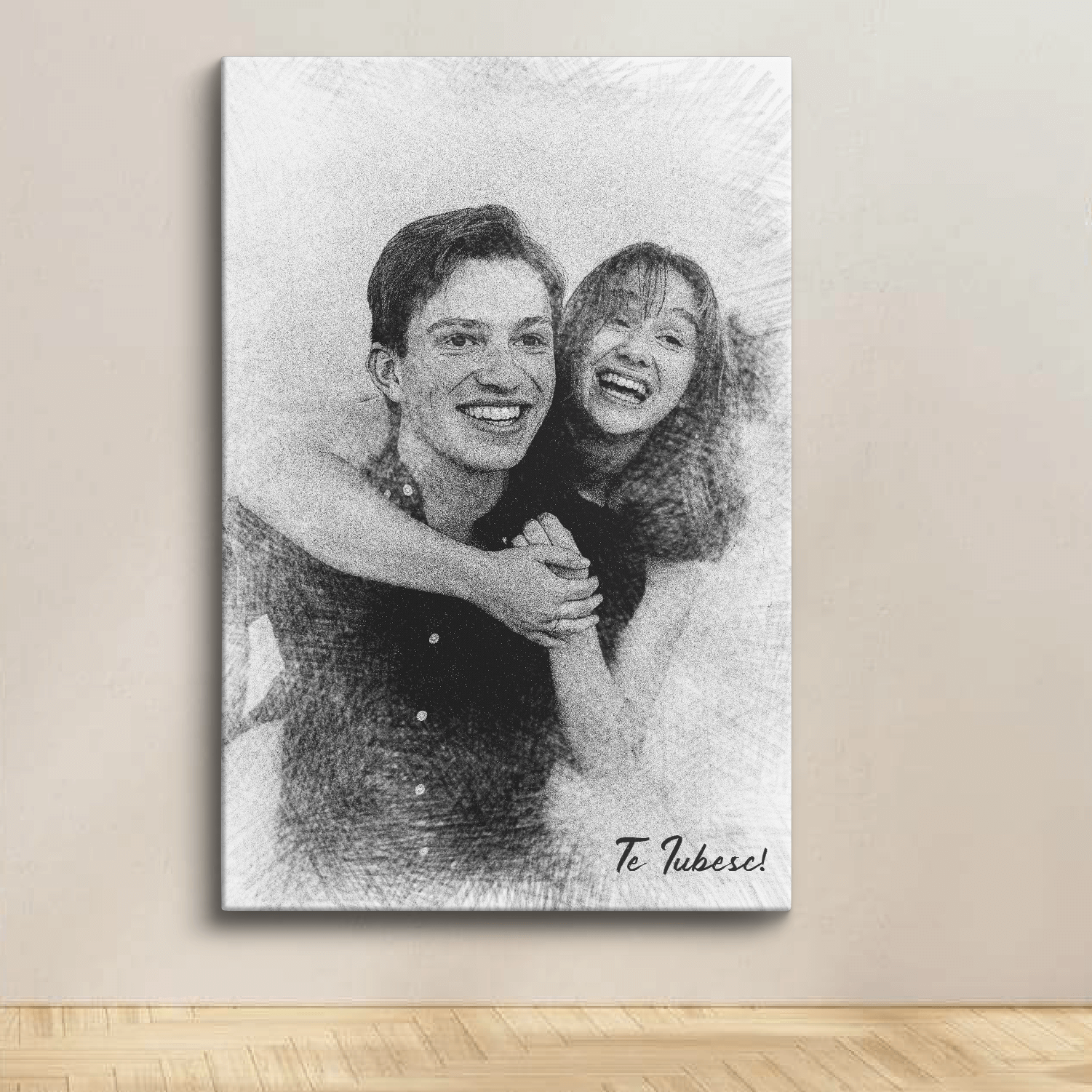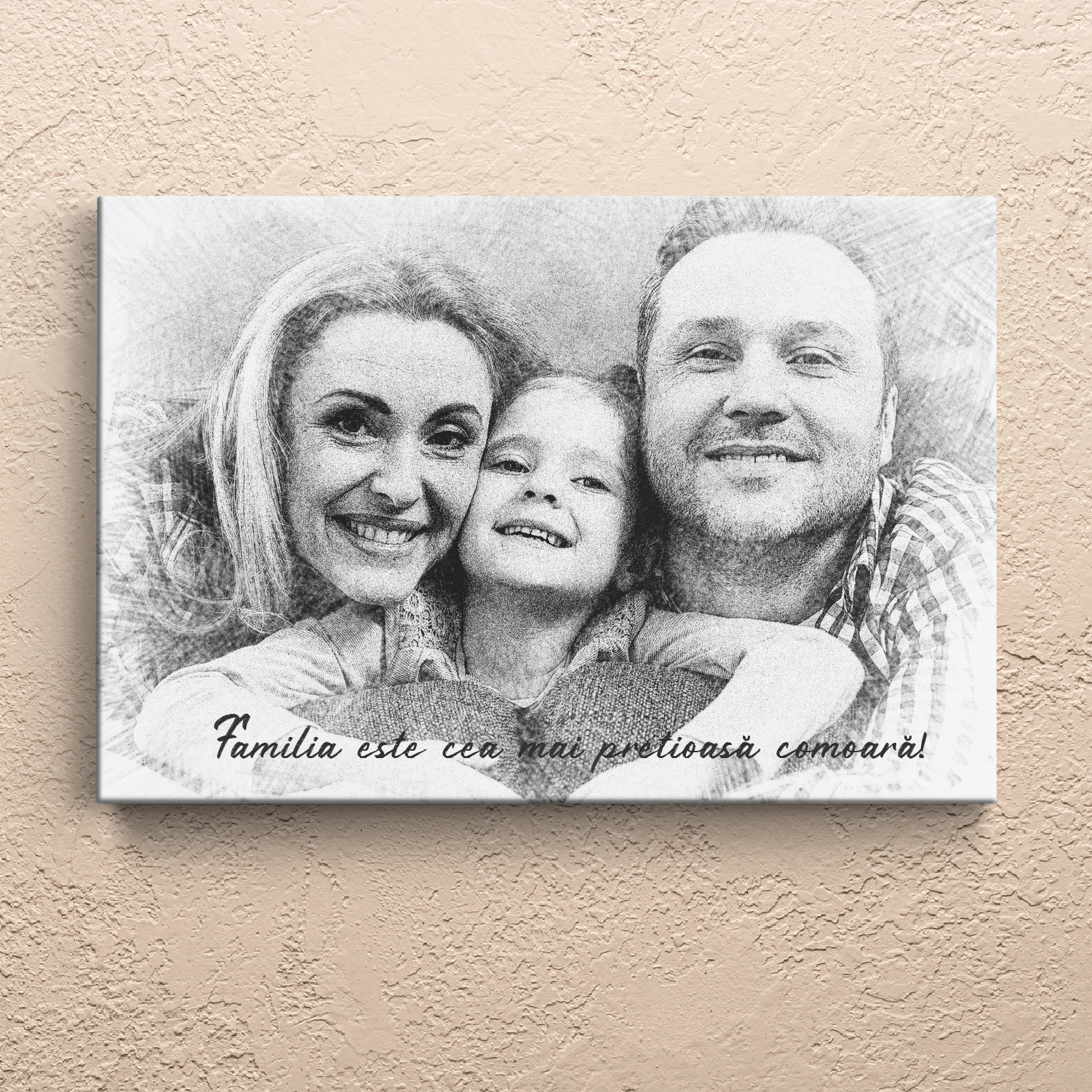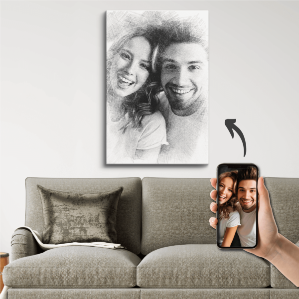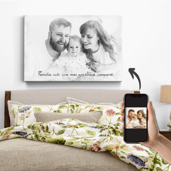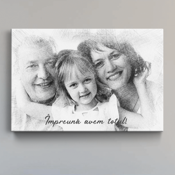 Transformă fotografia ta într-un portret în creion realizat digital pe un tablou din pânză canvas. Alege dimensiunea dorită, încarcă fotografia si plasează comanda. Opțional poți alege să adaugi și un text contra cost, iar colegii noștri îți vor trimite în 24 ore pe whatsapp sau email o previzualizare grafică a tabloului tău pt confirmare după care vom realiza fizic tabloul și îl vom expedia.