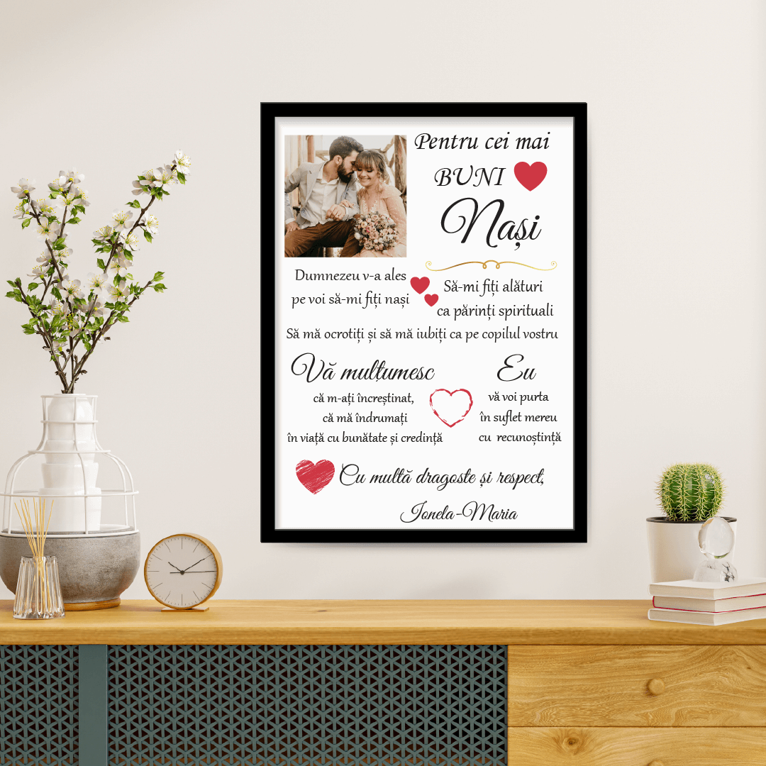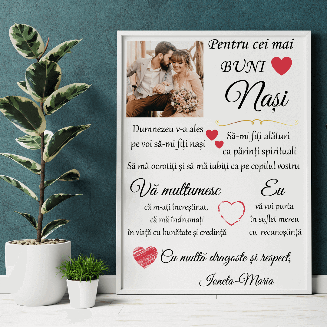 Ești în căutarea unui cadou personalizat pentru nași? Ce spui de un tablou personalizat cu o poză și un mesaj reprezentativ? Surprinde-i și tu în cel mai frumos și inedit mod. Oferă o amintire peste care timpul nu poate trece!